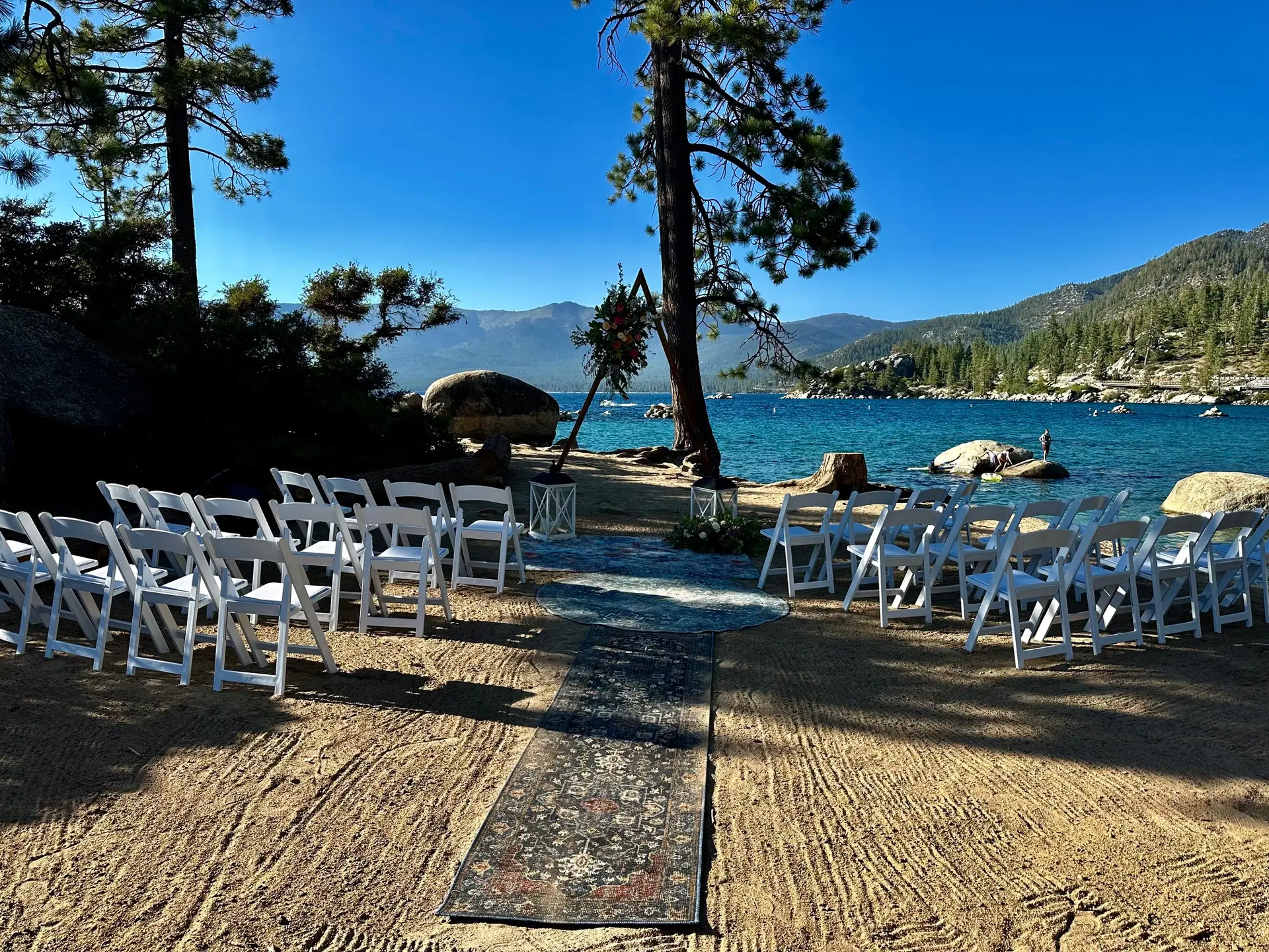 A stunning boho-style ceremony at Sand Harbor, featuring our elegant triangle arch, lanterns, and pristine white resin chairs. The breathtaking Lake Tahoe backdrop made this setup truly unforgettable for the happy couple. Perfect for couples seeking a magical, lakeside wedding in Lake Tahoe.