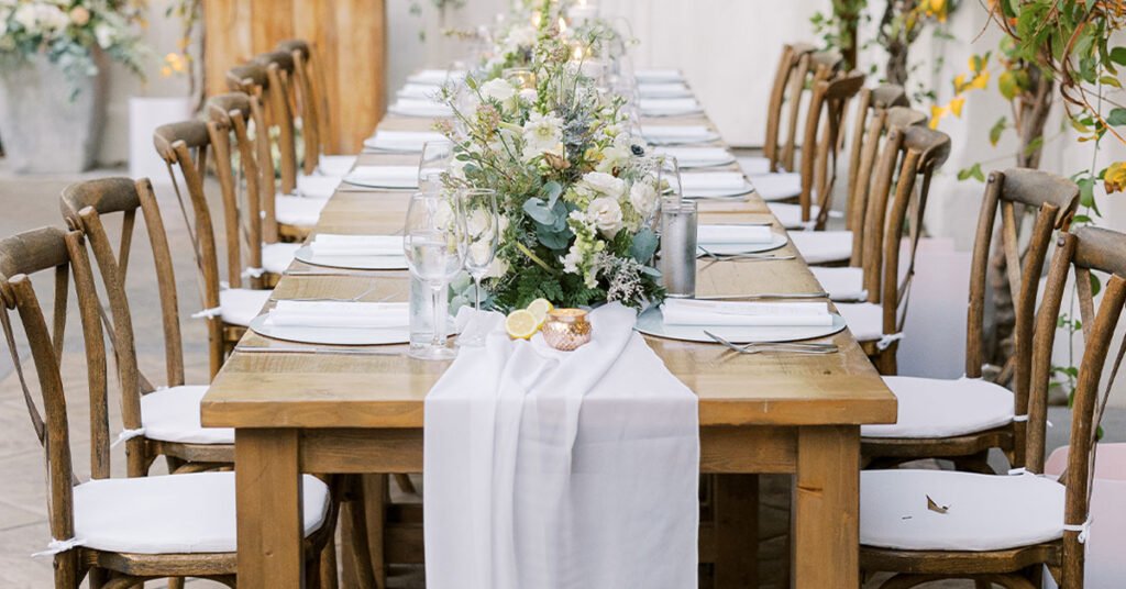 To throw a modern-themed wedding, think minimalist canvases with clean lines, geometric shapes, and neutral hues. Tucking black chairs into mirrored tables embellished with white blooms and glass elements is a fantastic way to bring this aesthetic to life.