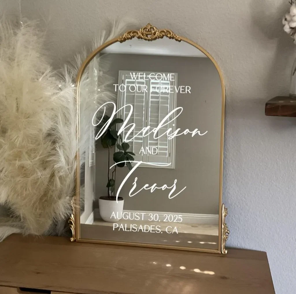 Welcome To Our Wedding OR Welcome To The Wedding OF Sign is customizable with names and date for our mirror Wedding mirror decal is in addition to the mirror rental
