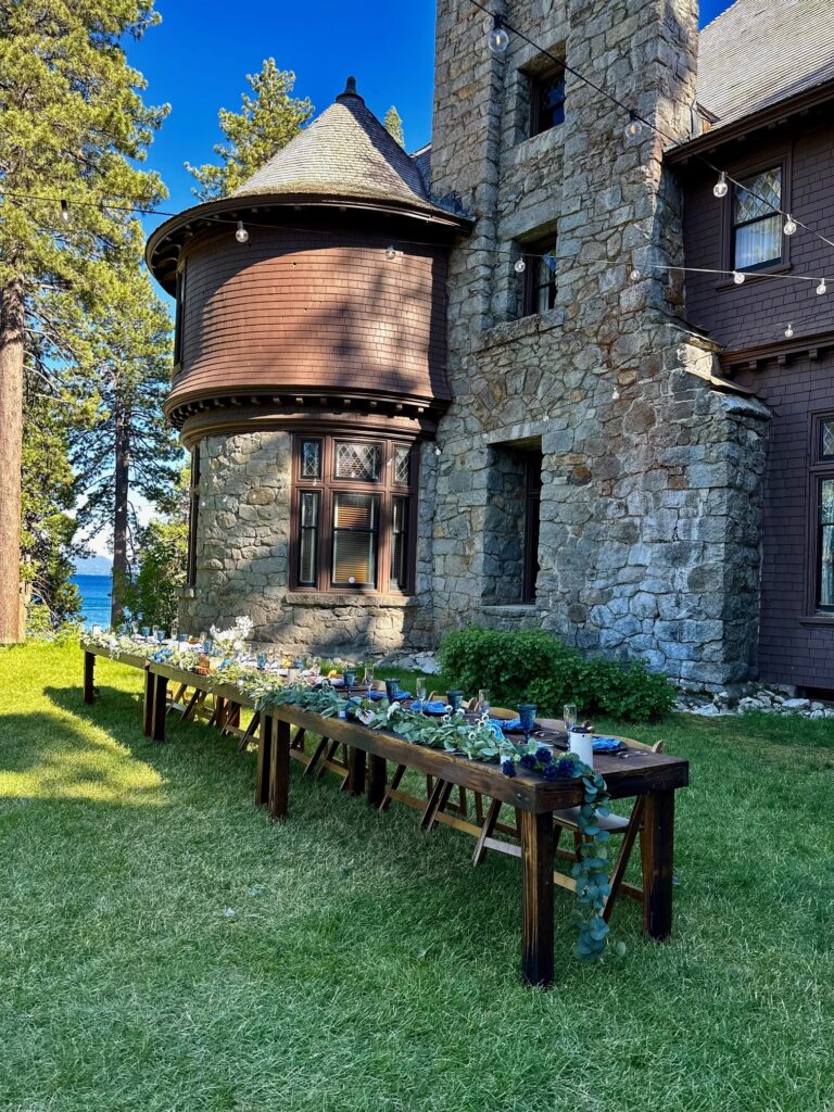 This beautiful handcrafted Farmhouse Dining Table measures 40″ wide by 8′ long, offering rustic charm and timeless elegance for weddings, parties, and special events in Lake Tahoe.