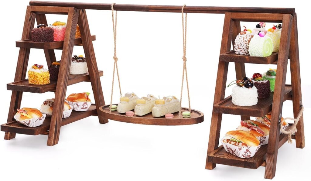 Solid wood & charcoal burning Process, made of premium solid wood, this 3 tier swing cupcake stand features a professional charcoal burning process, which highlights the natural texture of the wood and ensures sturdiness and long service life. The simple style design blends perfectly with any party decor, whether it’s a rustic, modern, or classic theme, and the wooden color adds a warm and natural atmosphere to your event.