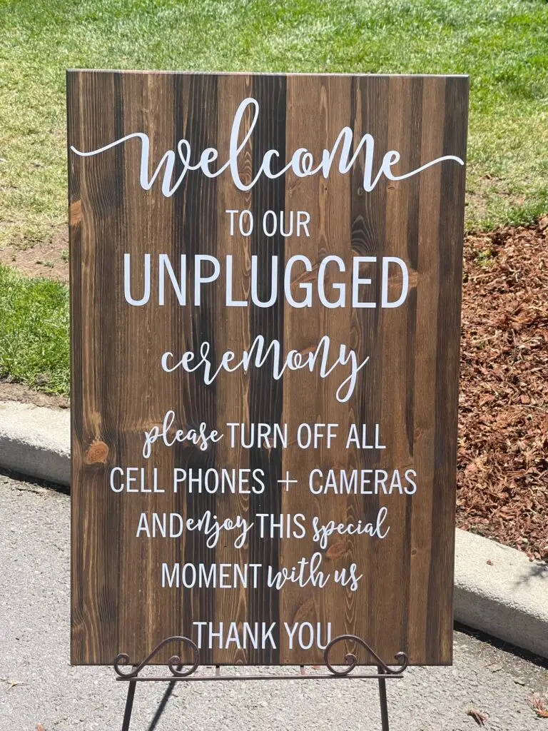 Wooden “Unplugged Ceremony” sign with either wooden or iron easel